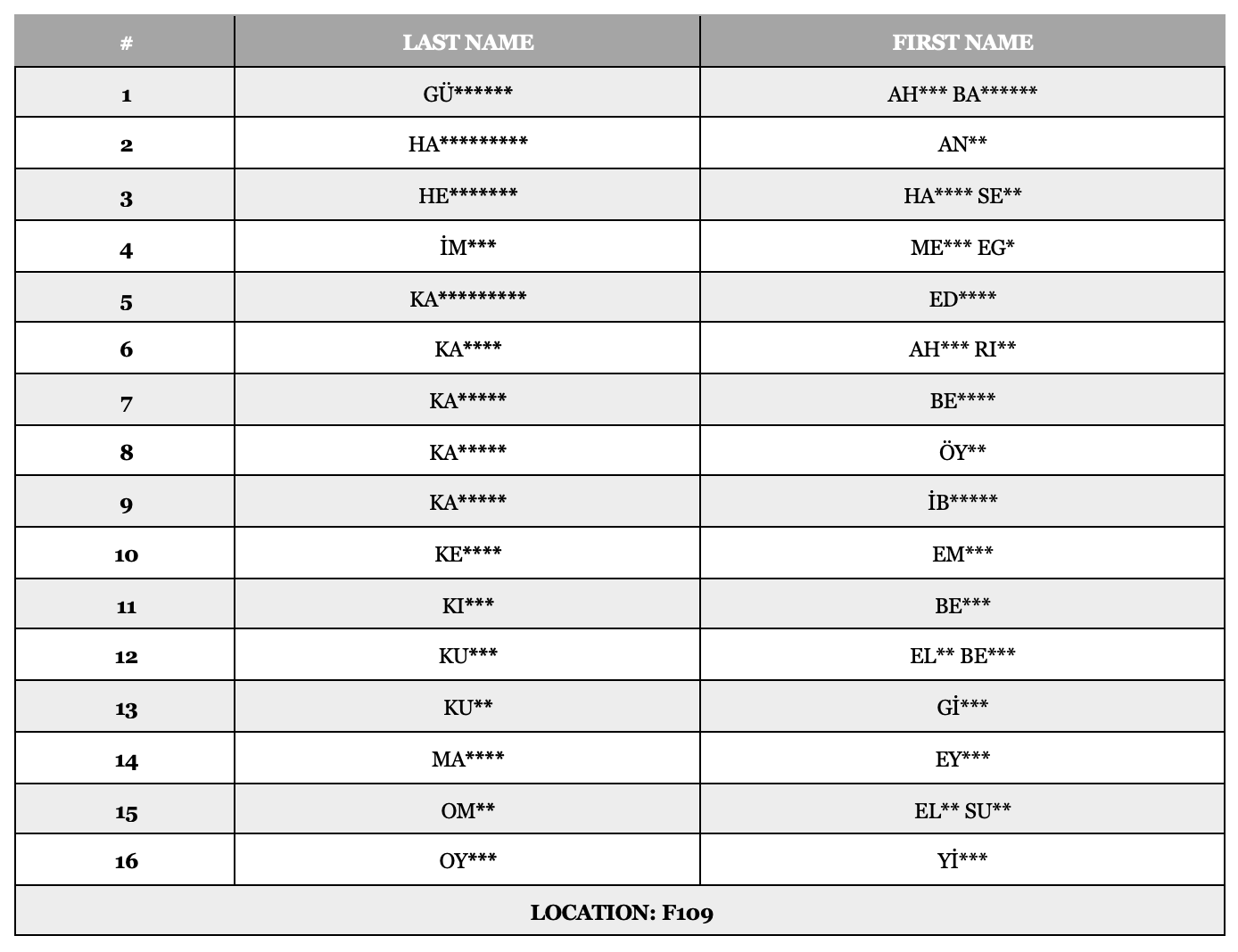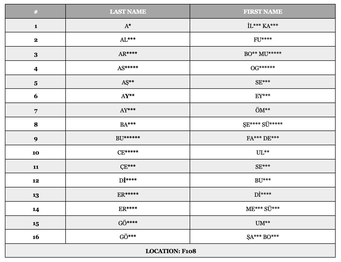 Please find below the list of candidates who are qualified for the Master's interviews that will take place on April 15, 2026. All three interview groups will start at 1:30 PM and will follow the order listed below. Please note that all classes on the list are located in Building A of our Faculty.