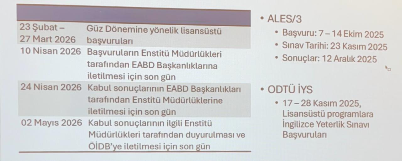 Önümüzdeki akademik yıl için (2026-2027) yüksek lisans ve doktora programlarımıza başvurmayı düşünüyorsanız aşağıdaki görselde yer alan takvimi dikkate almanızı önemle rica ediyoruz. Başvuru, sınav ve sonuçların bildirilmesi ile ilgili tarihler öne çekildi. Özellikle ALES sınavı çok önemli, önümüzdeki hafta başvurmanız gerekebilir.